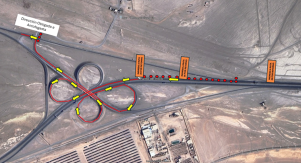 - Pasar la señalética que indica Chañaral – Antofagasta, la cual estará debidamente cerrada con conos.