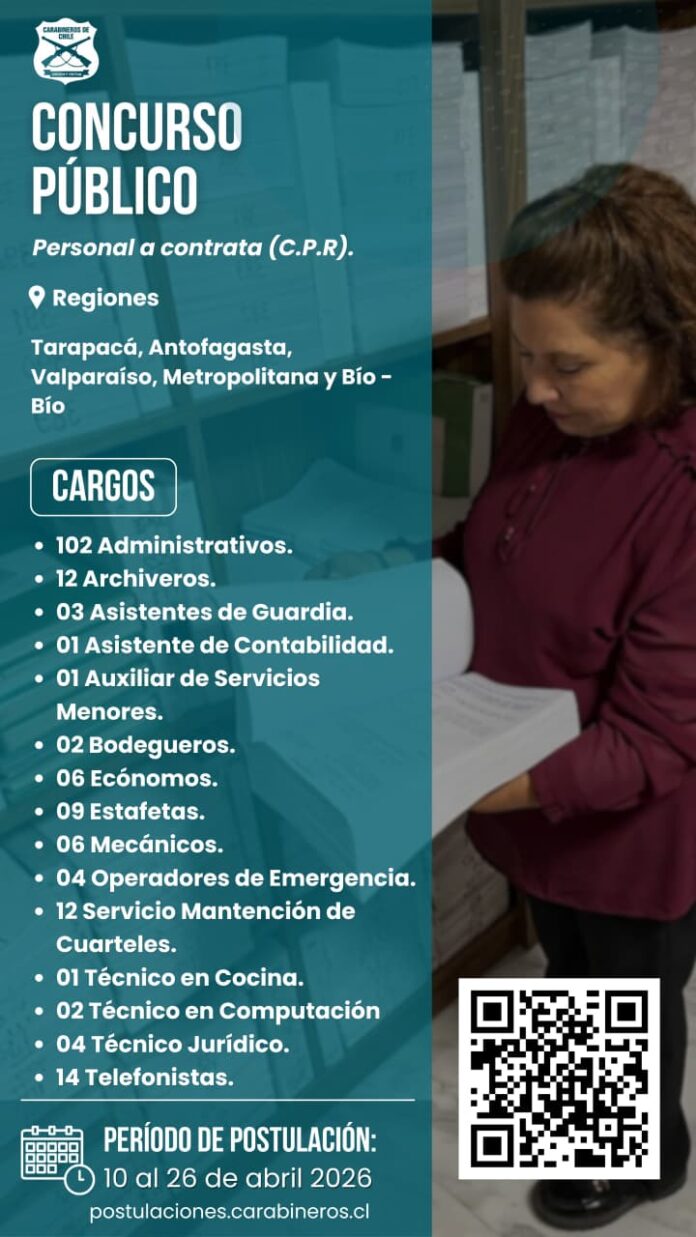 Con la finalidad de fortalecer las áreas profesionales, técnicas, administrativas especializadas y no especializadas para los distintos servicios; Carabineros de Chile, por intermedio del Departamento de Personal Civil de Carabineros P5, anunció la apertura de 179 puestos de trabajo, los que estarán disponibles para postulación entre el 10 de abril hasta el 26 de abril.