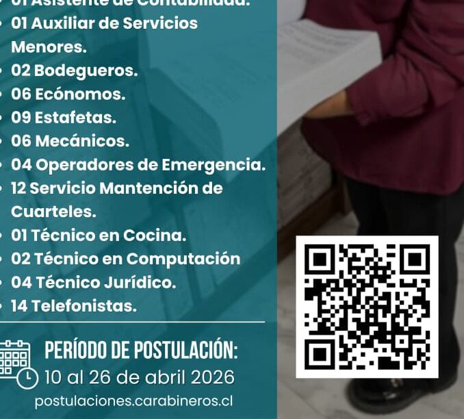 El proceso de postulación se desarrollará a través de los canales oficiales de Carabineros, donde los interesados podrán revisar los requisitos específicos de cada cargo y formalizar su postulación.