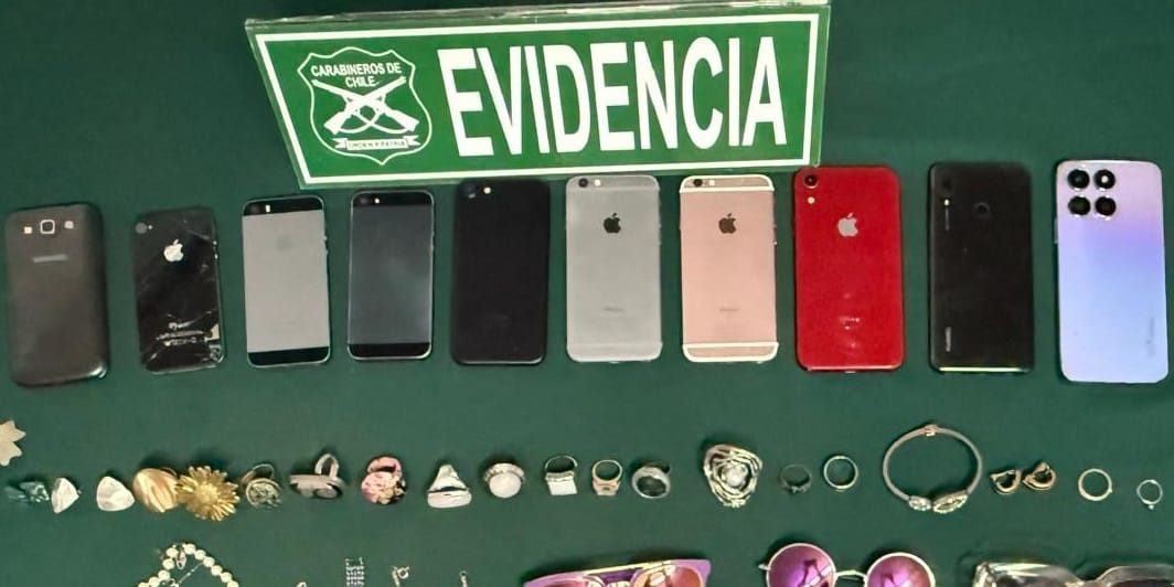 Además, agregó el jefe de la unidad, durante la revisión del móvil, Carabineros encontró 10 teléfonos celulares de distintas marcas y modelos, además de lentes y diversas joyas, especies que tendrían una presunta procedencia ilícita, posiblemente vinculadas a otros ilícitos cometidos por los detenidos, por lo que se llama a quienes se pudieran haber visto afectados a poder reconocer sus especies.