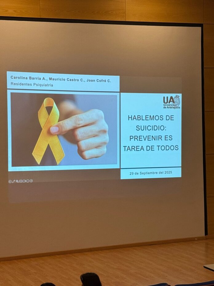 La actividad, desarrollada en el auditorio del Hospital Clínico de esta Casa de Estudios Superiores, estuvo dirigida por los médicos residentes del postgrado de Psiquiatría de la Universidad de Antofagasta, Dra. Carolina Barría Andrade y Dr. Mauricio Castro Cádiz, quienes compartieron conocimientos y estrategias prácticas para reconocer factores de riesgo, señales de alerta y medidas de apoyo oportuno.
