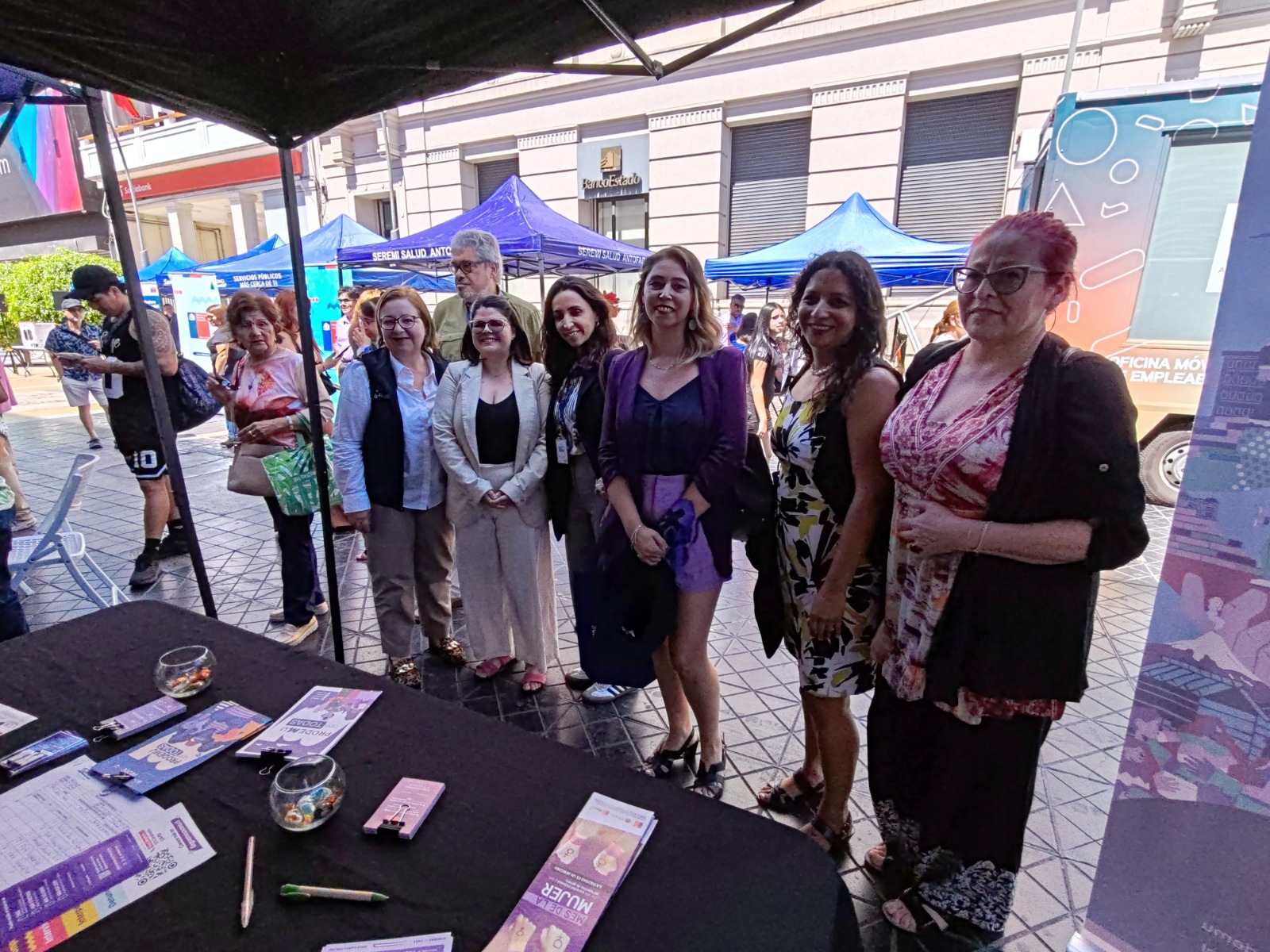 Las autoridades se dirigieron después a la esquina de calles Prat y San Martín donde se llevó a cabo la feria de servicios públicos con foco en la oferta programática del Estado para las mujeres, en una jornada de conmemoración, reflexión y compromiso con la igualdad de derechos que ofreció acceso, orientación e información en apoyo social, salud, autonomía económica y prevención de la violencia junto al Servicio Nacional de la Mujer y Equidad de Género (SERNAMEG), Fundación para la Promoción y Desarrollo de la Mujer (PRODEMU), Servicio Nacional de Capacitación y Empleo (SENCE), Seremi de Seguridad Pública junto a Carabineros del Chile, Seremi de Desarrollo Social y Familia, Seremi de Salud, Servicio Nacional para la Prevención y Rehabilitación del Consumo de Drogas y Alcohol (SENDA), Seremi de Vivienda y Urbanismo, Instituto de Previsión Social (IPS), Programa LAZOS, Fondo Nacional de Salud (FONASA), Corporación de Asistencia Judicial (CAJTA) y el Instituto Nacional de la Juventud (INJUV), jornada que además contó con la participación del Grupo Cultural Folclórico Hermandad Antofagasta que deleitó a los presentes con tres pies de cueca.