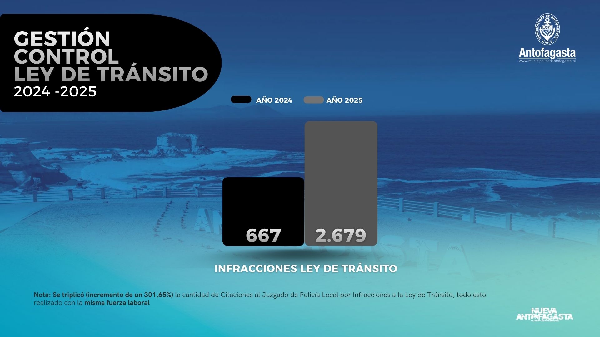 A ello se suma un crecimiento exponencial en lo referido a acciones para el control de la Ley de Tránsito, dado que se triplicó (incremento de un 301,65%) la cantidad de citaciones al Juzgado de Policía Local por Infracciones a la normativa. El 2024 se contabilizaron 667 citaciones, mientras que el 2025 hubo 2.679.