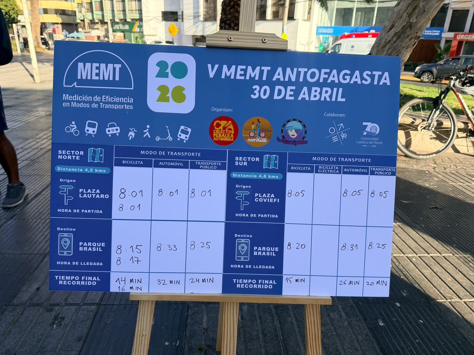 Con voluntarios en bicicleta, automóvil particular y microbús partiendo simultáneamente desde dos puntos de la ciudad, el Colectivo Pedalea Autonomía junto a la Escuela de Arquitectura de la Universidad Católica del Norte, Bici Rutas Culturales y Bicivilizadas, realizaron hoy la quinta edición de la Medición de Eficiencia en Modos de Transporte (MEMT) 2026 en Antofagasta. Los puntos de inicio fueron la Plaza Lautaro, en el sector norte, y la Plaza de la Coviefi, en el sector sur, con destino común en el Parque Brasil (calle Matta con Copiapó), cubriendo una distancia de aproximadamente 4,5 kilómetros en hora punta.